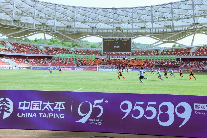 在20名太平人壽員工身著“中國太平”志愿者服裝組成的旗手隊(duì)手持中國太平標(biāo)志的中圈地鋪入場后,山東與江蘇兩支隊(duì)伍展開了激烈的對(duì)決。在助威團(tuán)的吶喊聲中,雙方隊(duì)員都展現(xiàn)出了出色的競技狀態(tài),經(jīng)過90分鐘的角逐,雙方最終以2:2握手言和,精彩的比賽贏得了現(xiàn)場觀眾的陣陣掌聲和喝彩。