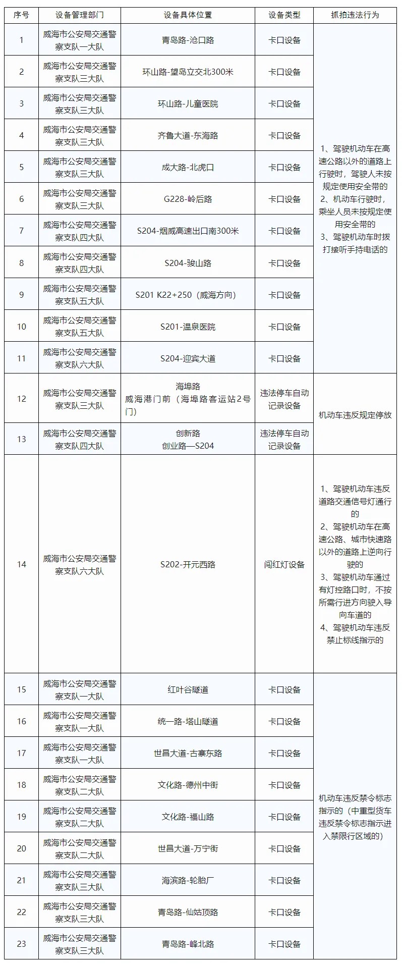 為保障道路交通安全,預(yù)防和減少交通事故的發(fā)生,根據(jù)《中華人民共和國道路交通安全法》及其實施條例等法律法規(guī)和相關(guān)技術(shù)規(guī)范的規(guī)定,依據(jù)《公安機關(guān)執(zhí)法公開規(guī)定》,現(xiàn)將新增的23處交通技術(shù)監(jiān)控設(shè)備予以公示,自2024年12月1日起,將對有關(guān)交通違法行為進(jìn)行依法管理,請廣大道路交通參與者自覺遵守相關(guān)法律法規(guī),共同維護(hù)良好的道路交通秩序。