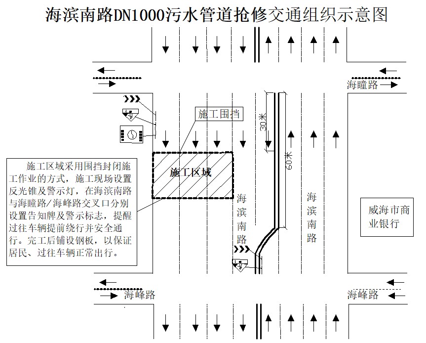 因海濱南路(海瞳路口向南40米)污水管道故障,經(jīng)相關(guān)部門(mén)批準(zhǔn),水務(wù)集團(tuán)于10月29日開(kāi)始對(duì)該處管道進(jìn)行維修,為確保工程順利實(shí)施及施工期間的交通安全,現(xiàn)公告如下: