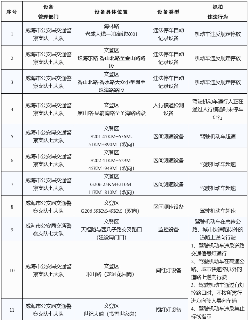 為有效預防和減少交通事故,確保道路交通安全、有序、暢通,根據(jù)《中華人民共和國道路交通安全法》及其實施條例等法律法規(guī)和相關技術規(guī)范的規(guī)定,依據(jù)《公安機關執(zhí)法公開規(guī)定》,現(xiàn)將新增11處15個交通技術監(jiān)控設備予以公示,自10月20日起,將對有關交通違法行為進行依法管理,請廣大交通參與者自覺遵守道路交通法律法規(guī),共同維護良好的道路交通秩序。