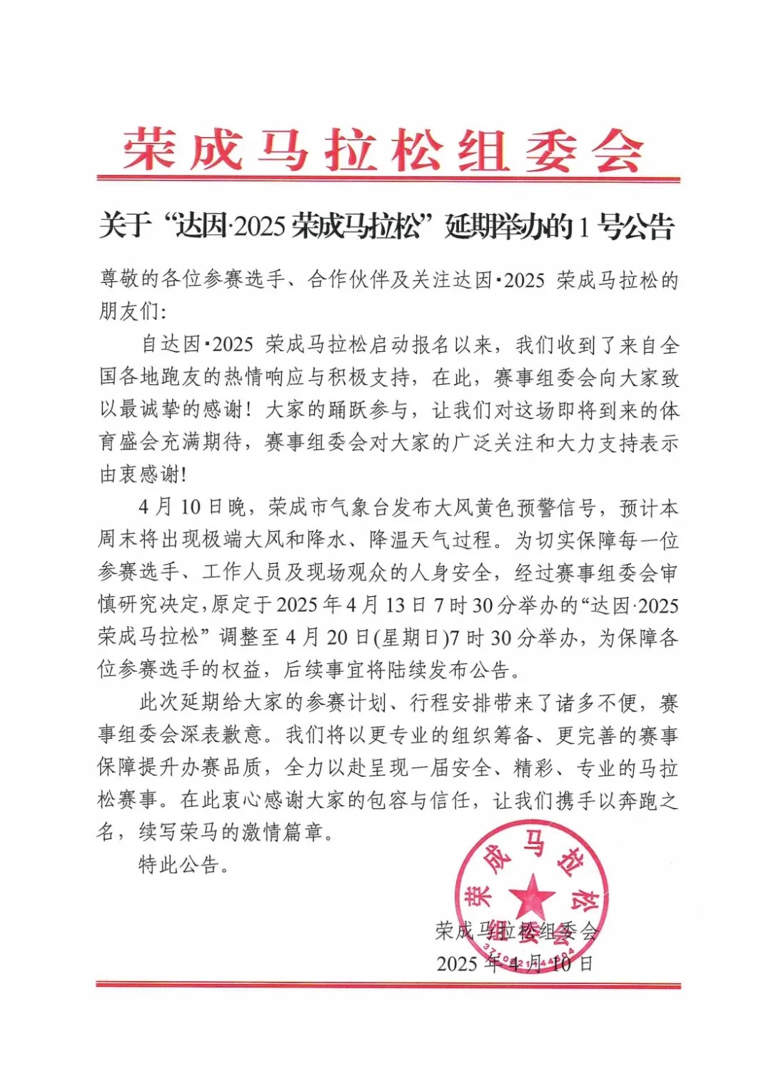 延期至4月20日,關(guān)于“達因·2025榮成馬拉松”延期舉辦的1號公告