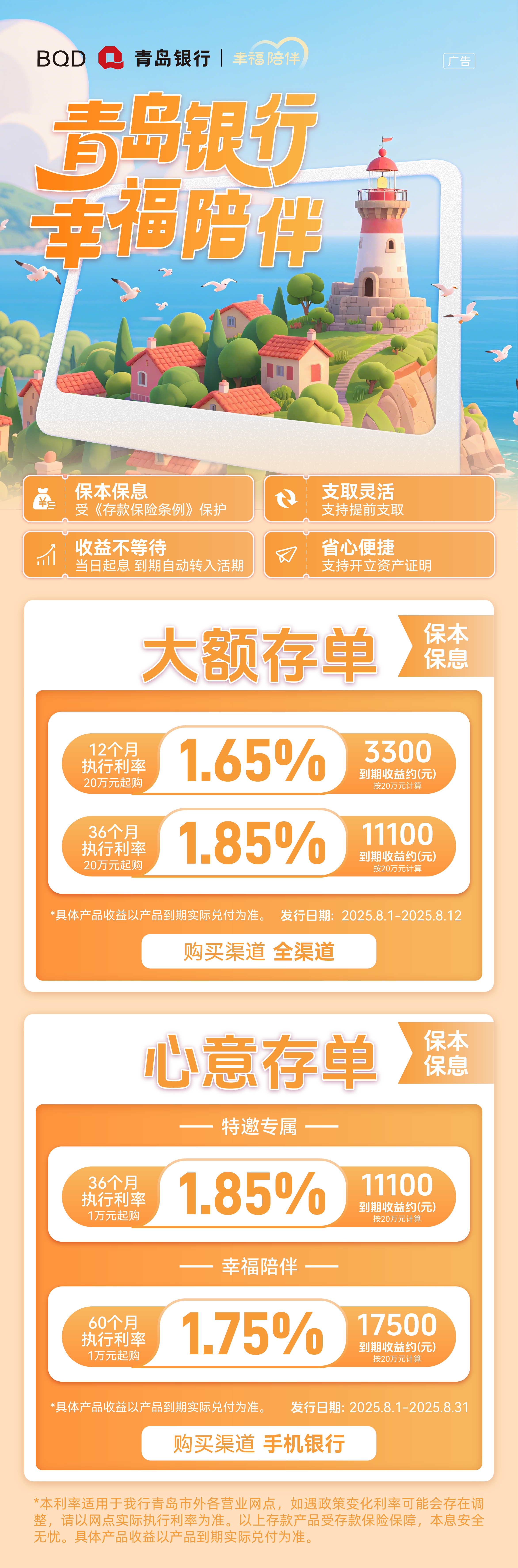 青島銀行幸福陪伴,8月份保本保息存單活動(dòng)