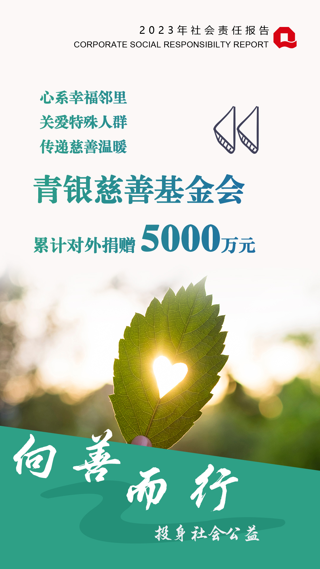 作為地方法人銀行,青島銀行始終秉持回饋社會(huì)的理念,積極投身公益事業(yè),不斷書寫“人民金融”的新篇章:“幸福鄰里”深入社區(qū),開展“黨建+志愿”活動(dòng)718場,讓群眾感受“不一樣”的金融服務(wù),受眾達(dá)5.53萬人;關(guān)愛特殊人群,“青馨服務(wù)”再向前一步,銀發(fā)服務(wù)交出溫情答卷,“青馨工作室”獲中國金融工會(huì)“全國創(chuàng)新工作室”命名表彰;青銀慈善基金會(huì)傳遞慈善溫暖,積極開展捐資助學(xué)、扶弱濟(jì)貧、綠色公益、美麗鄉(xiāng)村建設(shè)等公益活動(dòng)。2023年,青島銀行、青銀慈善基金會(huì)合計(jì)對外捐贈(zèng)367萬元,榮獲“青島紅十字博愛金獎(jiǎng)”、《大眾日報(bào)》“2023年社會(huì)責(zé)任企業(yè)”榮譽(yù)稱號。